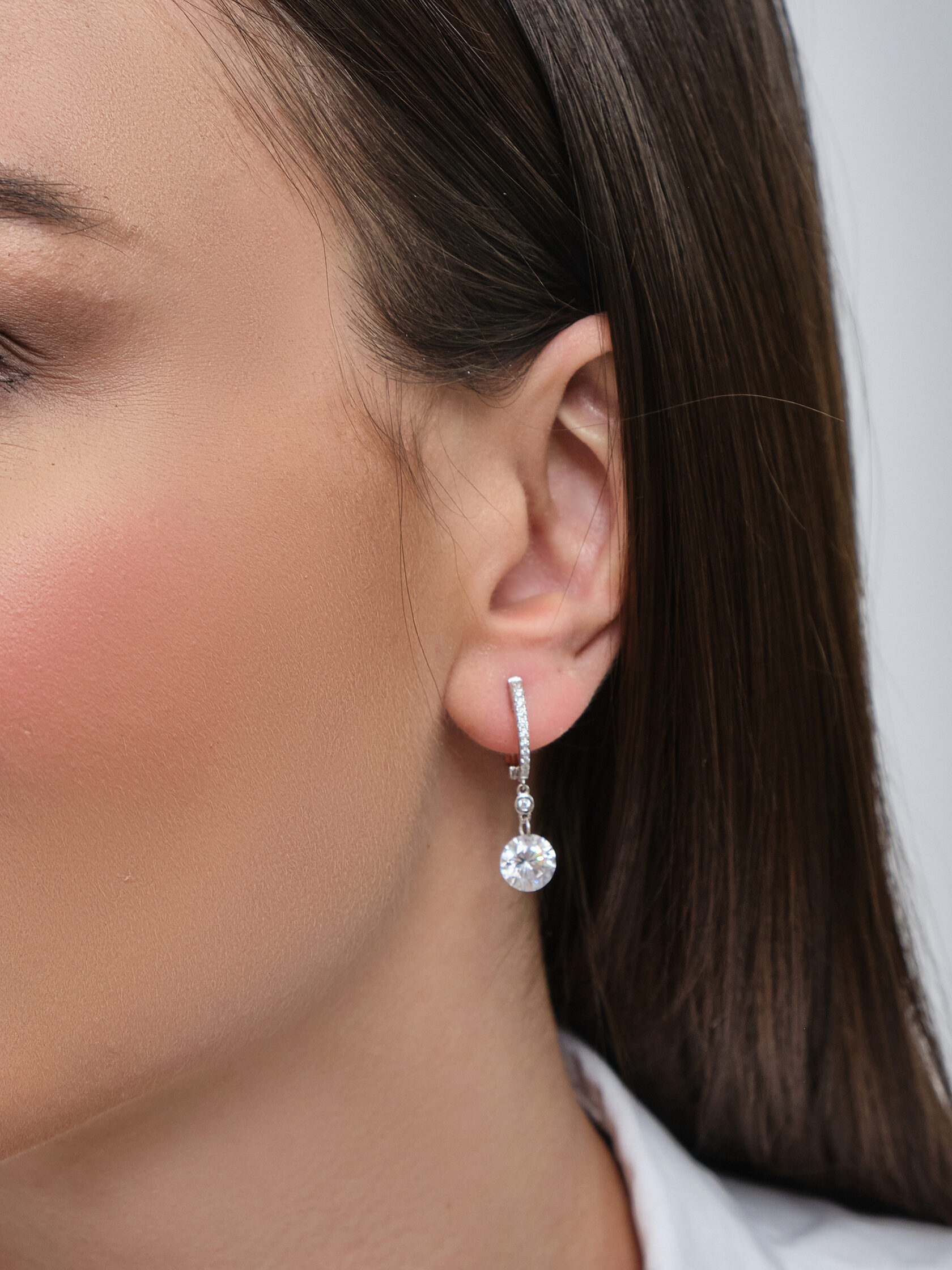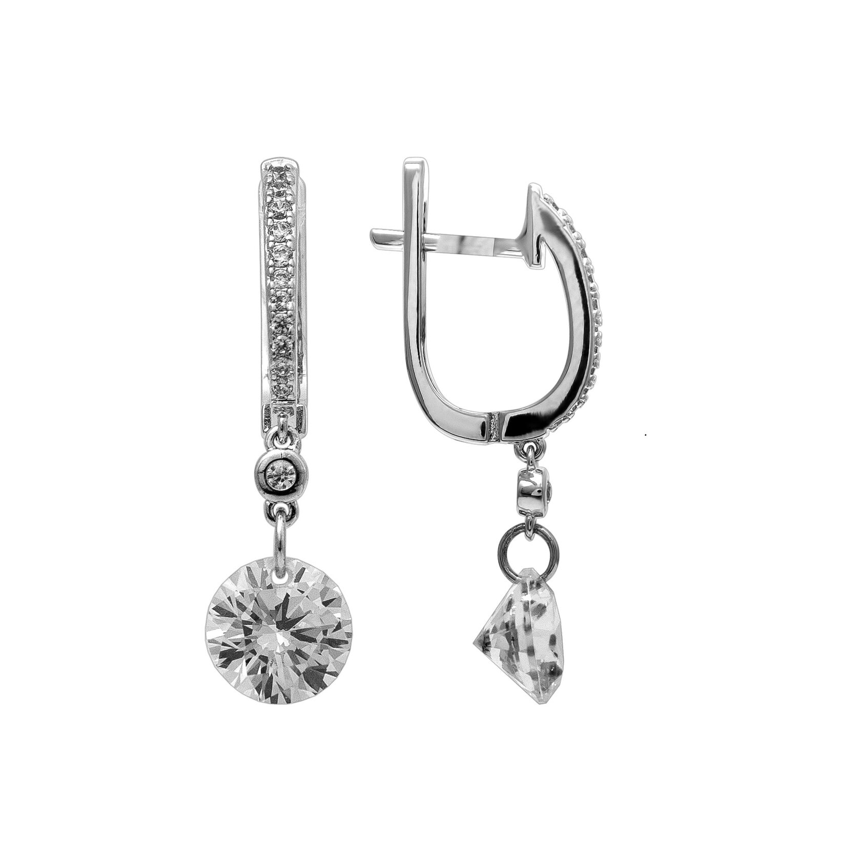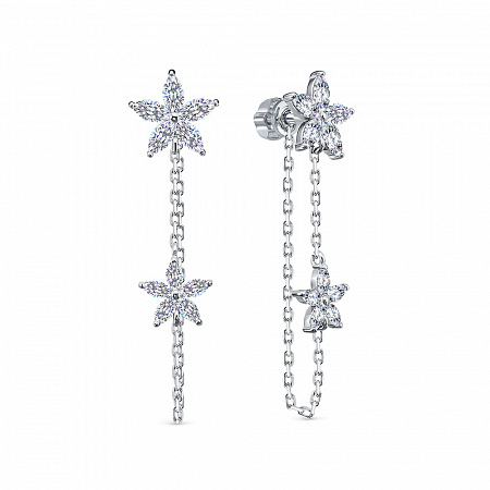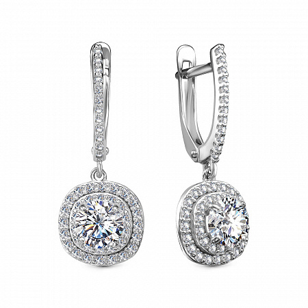 Серьги из серебра 925 пробы с подвесной частью. Подходят для ношения на каждый день или создания праздничного образа. Сочетается с любым стилем в одежде. Подходит для создания свадебного образа. Детали: Изготовлены из серебра 925 пробы, покрыты родием. Вставки - фианиты высшего качества бриллиантовой огранки. Английский замок. Внутренний размер замка для посадки на мочку уха - 8,5 мм. Толщина лицевой части с дорожкой камней - 1,5 мм. Общая длина серьги - 28,5 мм. Длина подвесной части - 14,5 мм. Диаметр центрального камня - 7,5 мм.