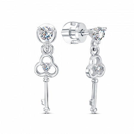Серьги из серебра 925 пробы с подвесной частью - ключиком. Подходят для ношения на каждый день или создания праздничных образов. Сочетаются с любым стилем в одежде. Детали: изготовлены из серебра 925 пробы. Покрыты родием. Вставка - фианиты высшего качества бриллиантовой огранки. Винтовой замок.