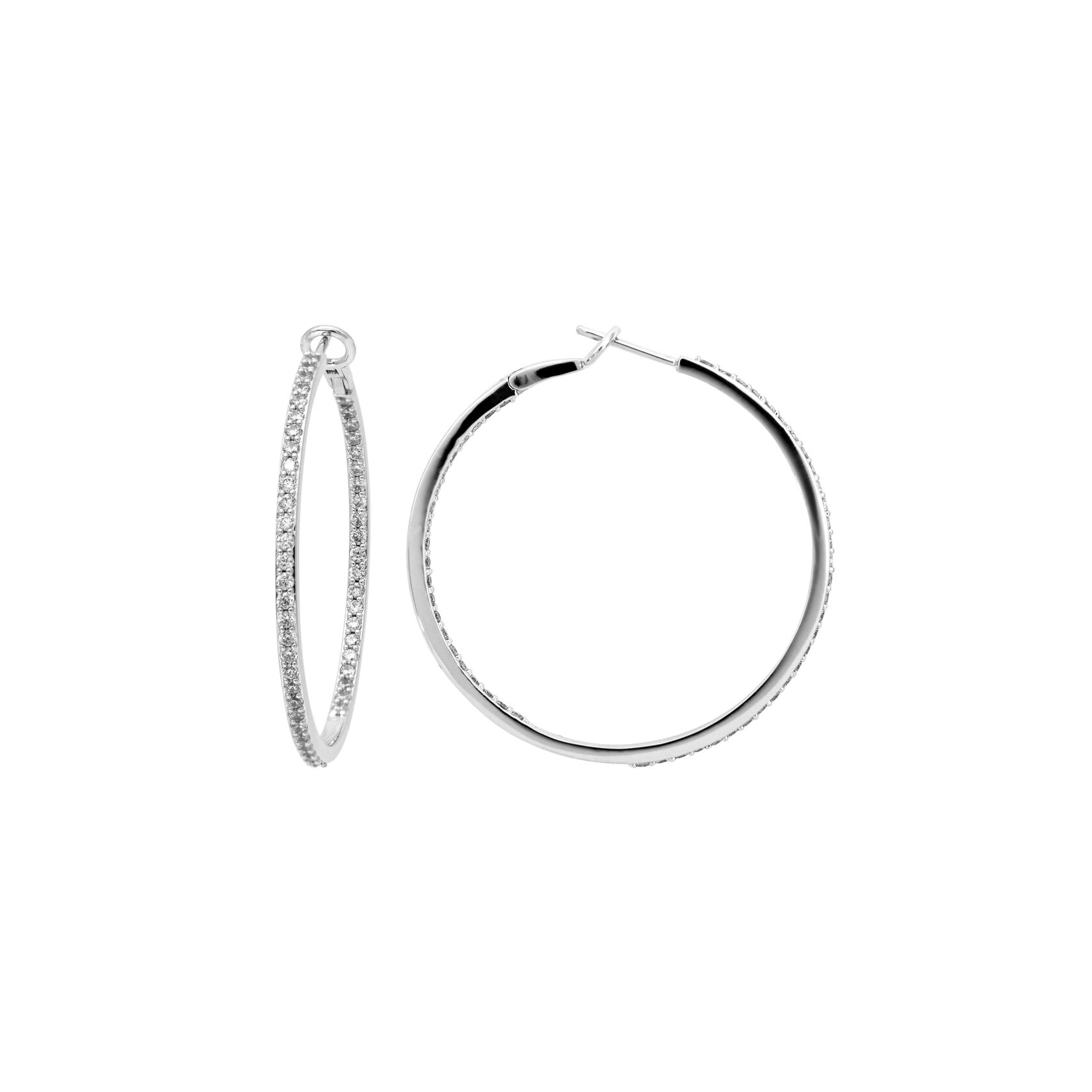 Большие серьги-кольца из серебра 925 пробы с фианитами. Сочетаются с образами в стиле кэжуал, вечерними образами. Подходят для ношения на каждый день. Детали: Изготовлены из серебра 925 пробы, покрыты родием. Вставки - фианиты высшего качества бриллиантовой огранки. Ширина - 2 мм. Диаметр серьги - 40 мм.