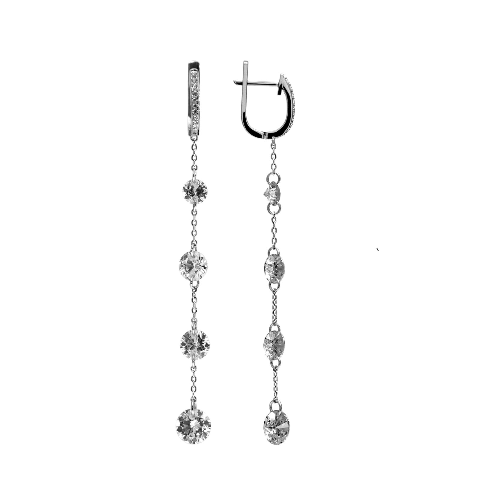 Серьги из серебра 925 пробы с подвесной частью. Подходят для ношения на каждый день или создания праздничных образов. Сочетаются с любым стилем в одежде. Детали: Изготовлены из серебра 925 пробы, покрыты родием. Вставка - фианиты высшего качества бриллиантовой огранки. Английский замок. Размер центральных камней 7 мм, 6 мм и 5 мм. Размер подвесной части с камнями - 62,5 мм. Общая длина серьги - 76,2 мм. Внутренний размер замка для посадки на мочку уха - 7,7 мм.