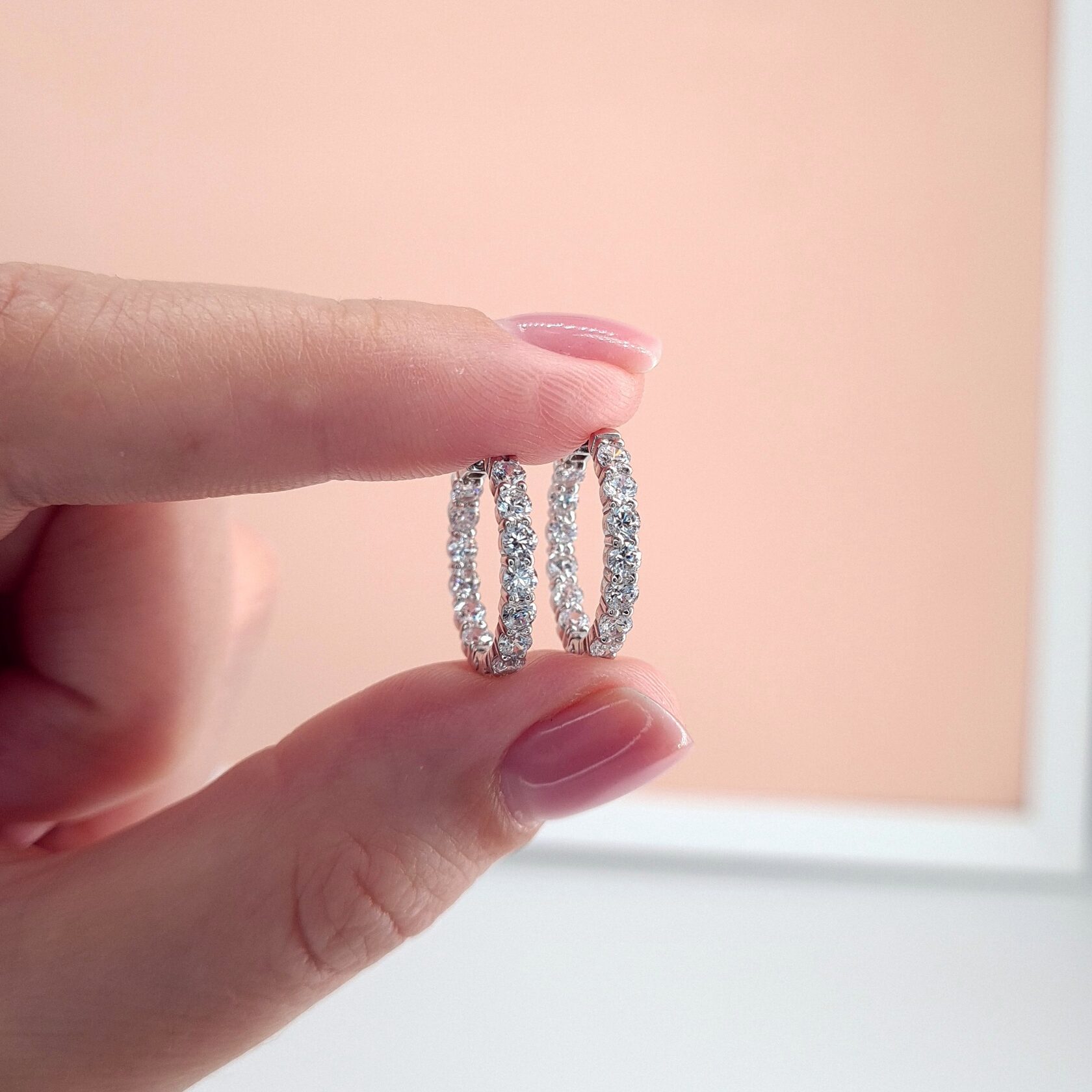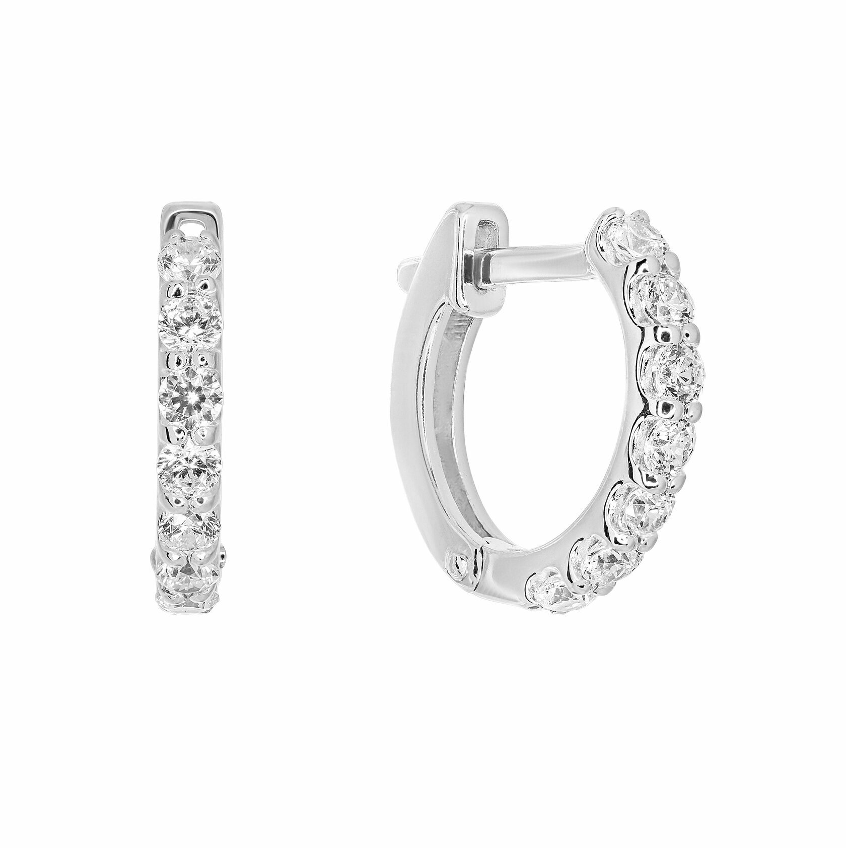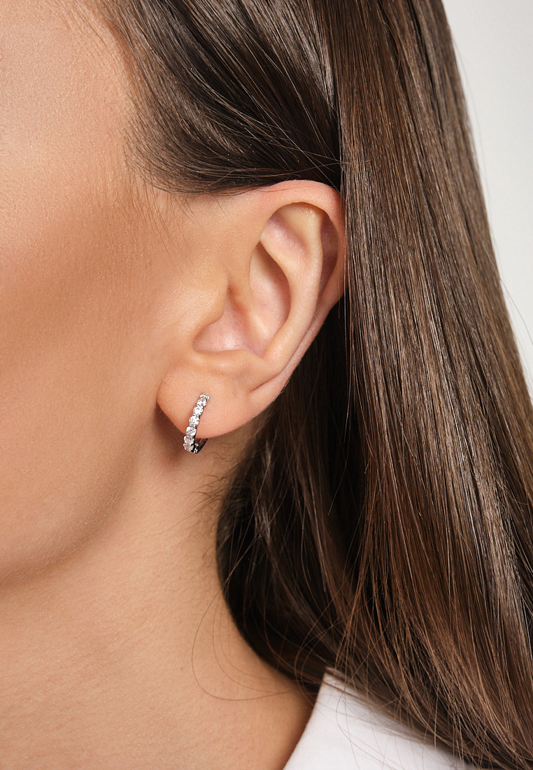 Маленькие серьги-кольца из серебра 925 пробы. Сочетаются с образами в стиле кэжуал, вечерними образами. Подходят для ношения на каждый день. Можно использовать для создания сетов из нескольких серег на ухе. Детали: Изготовлены из серебра 925 пробы, покрыты родием. Вставки - фианиты высшего качества бриллиантовой огранки. Ширина лицевой части с камнями - 1,8 мм. Внутренний диаметр серьги для посадки на мочку уха - 8 мм.